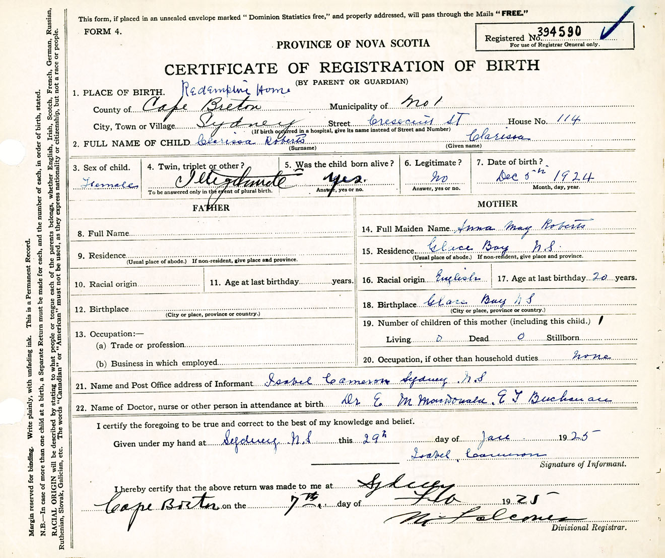 Female Birth Registration: Year: 1924 number: 39400590