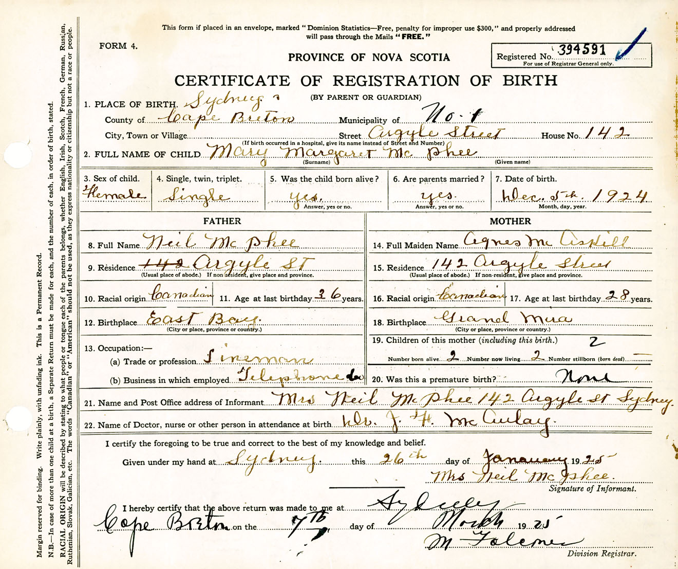 Female Birth Registration: Year: 1924 number: 39400591