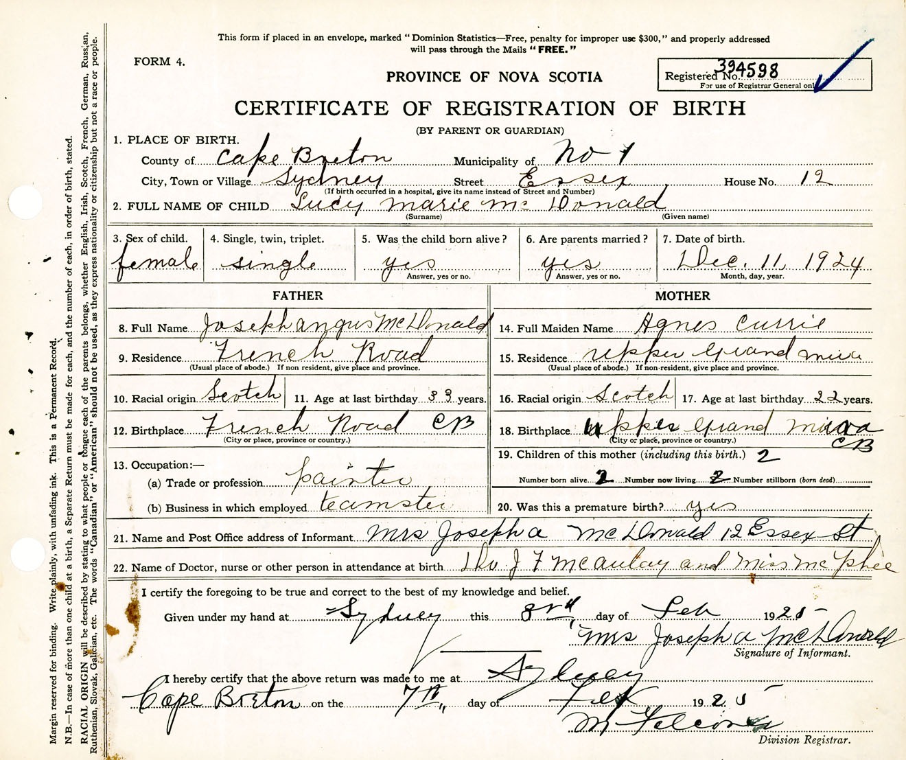 Female Birth Registration: Year: 1924 number: 39400598