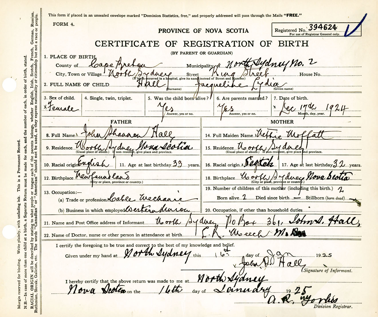Female Birth Registration: Year: 1924 number: 39400624