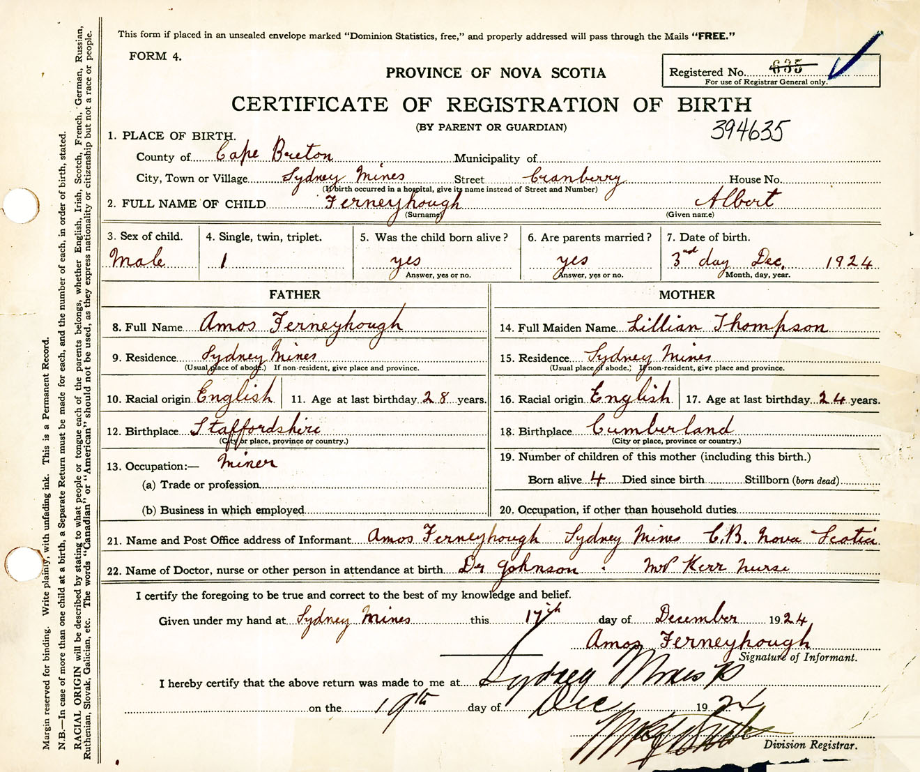 Male Birth Registration: Year: 1924 number: 39400635