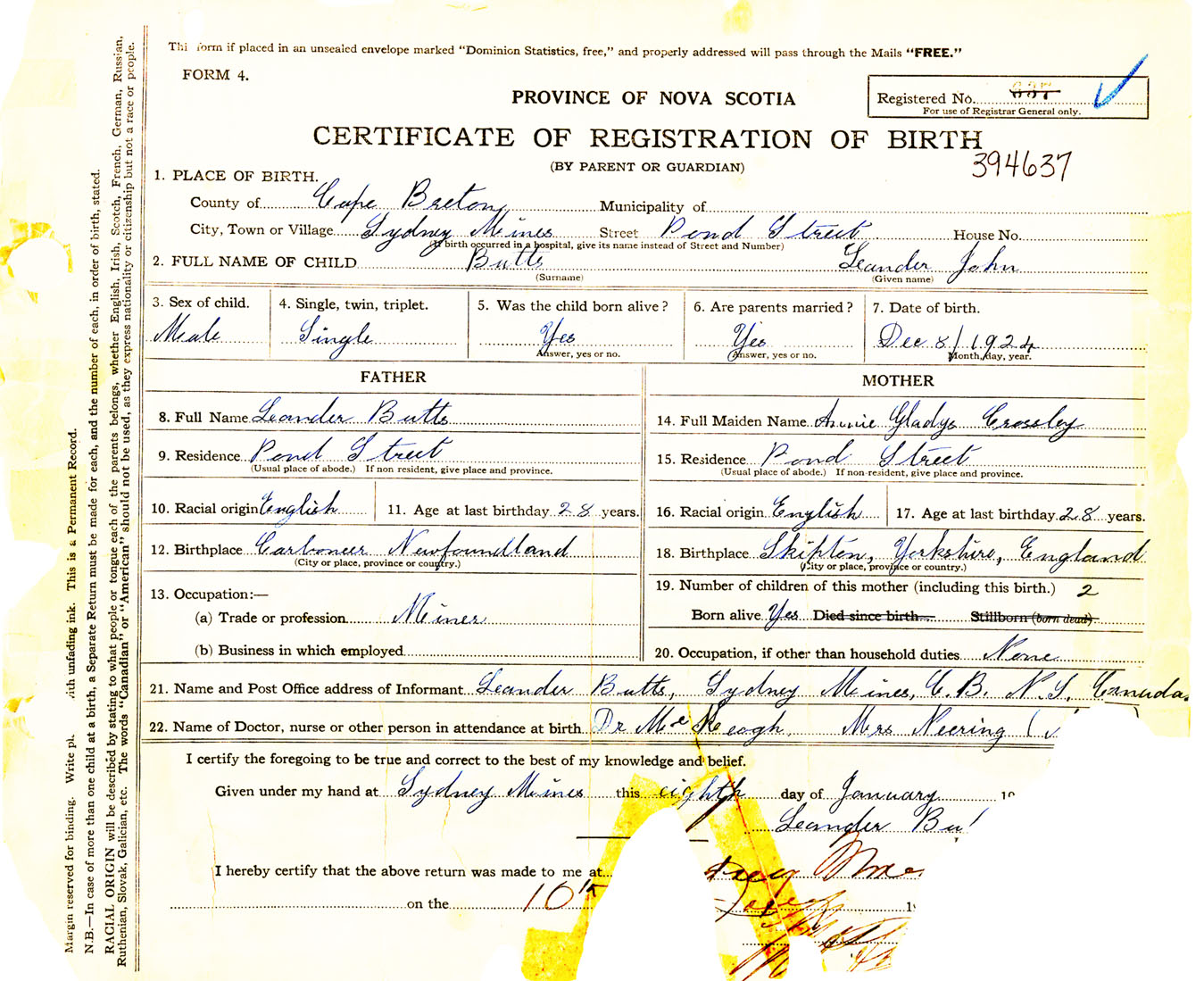 Male Birth Registration: Year: 1924 number: 39400637