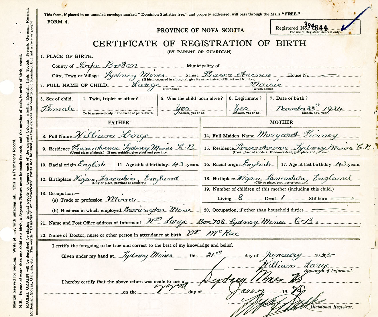 Female Birth Registration: Year: 1924 number: 39400644
