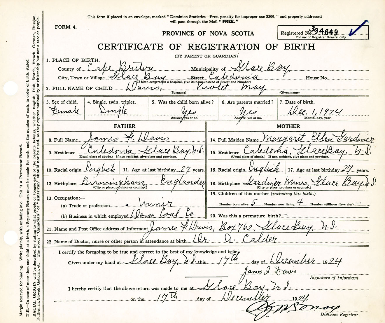 Female Birth Registration: Year: 1924 number: 39400649
