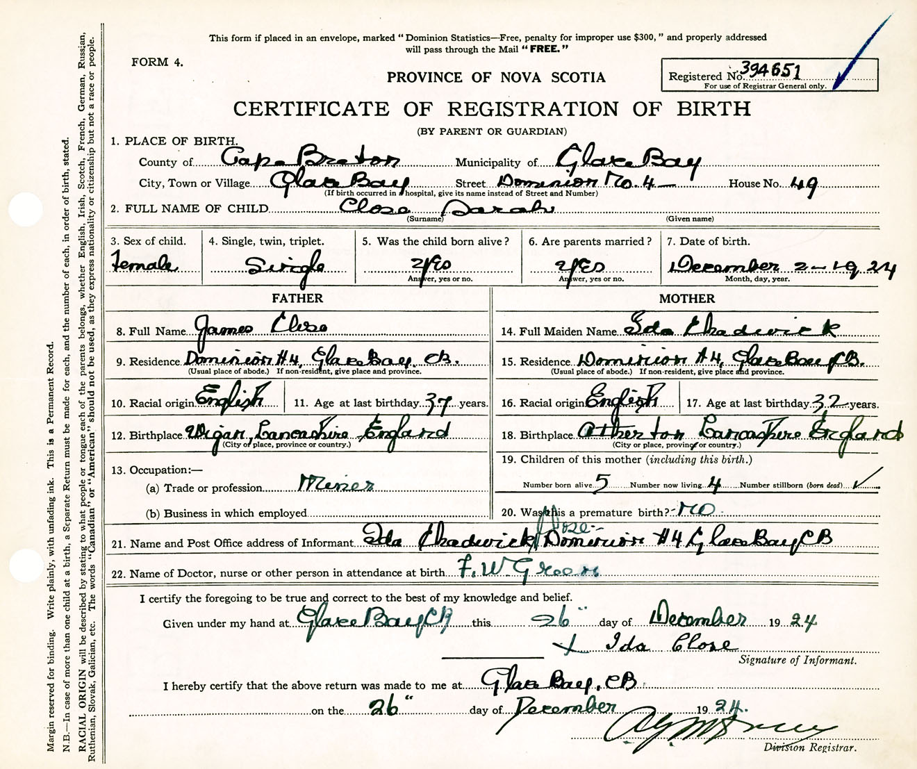 Female Birth Registration: Year: 1924 number: 39400651