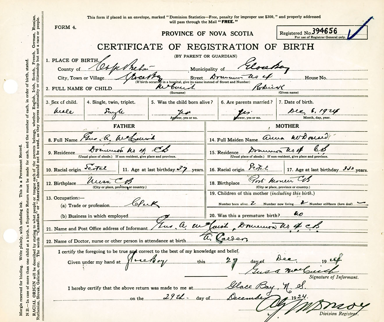 Male Birth Registration: Year: 1924 number: 39400656