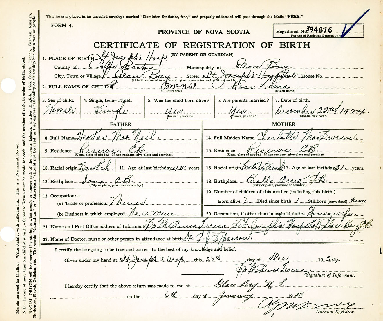 Female Birth Registration: Year: 1924 number: 39400676