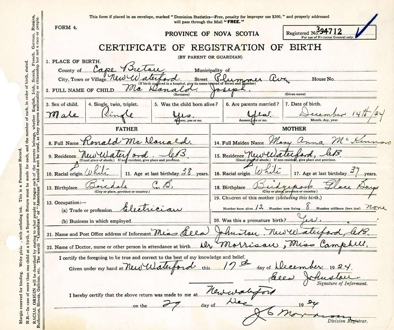 Male Birth Registration: Year: 1924 number: 39400712