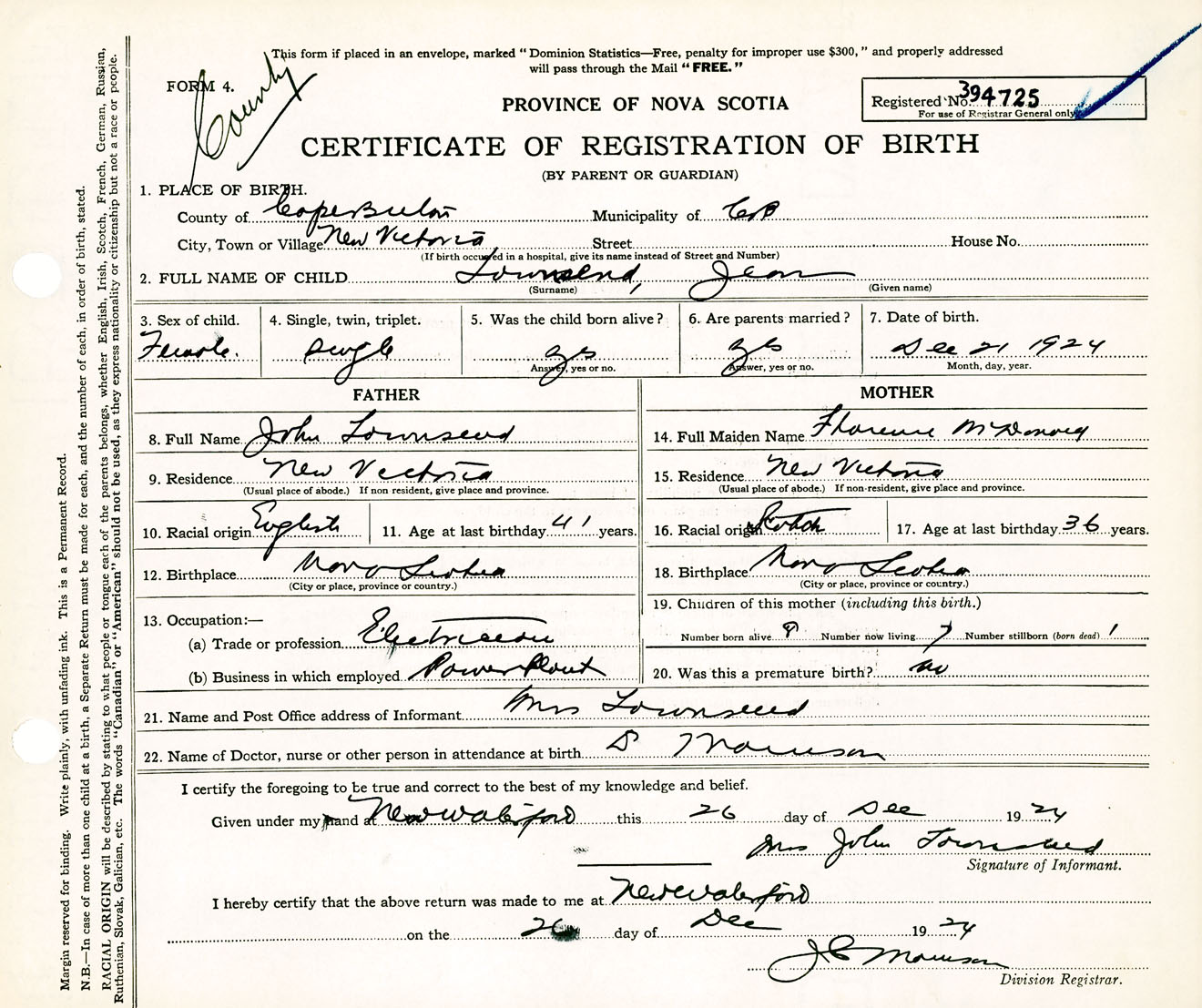 Female Birth Registration: Year: 1924 number: 39400725