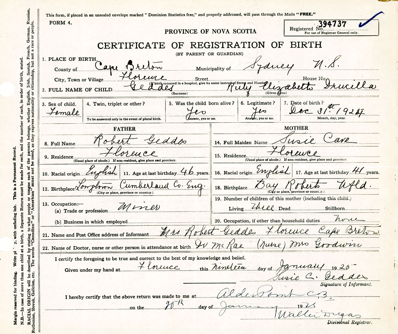Female Birth Registration: Year: 1924 number: 39400737