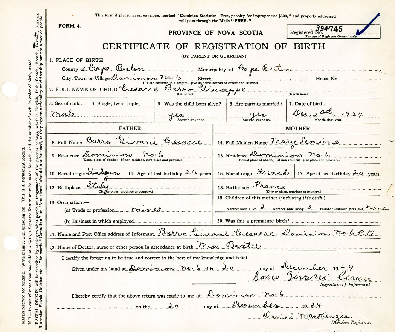 Male Birth Registration: Year: 1924 number: 39400745