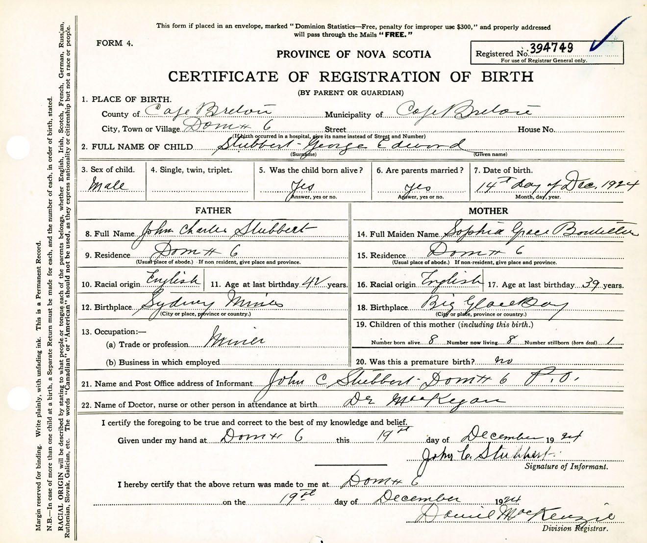 Male Birth Registration: Year: 1924 number: 39400749