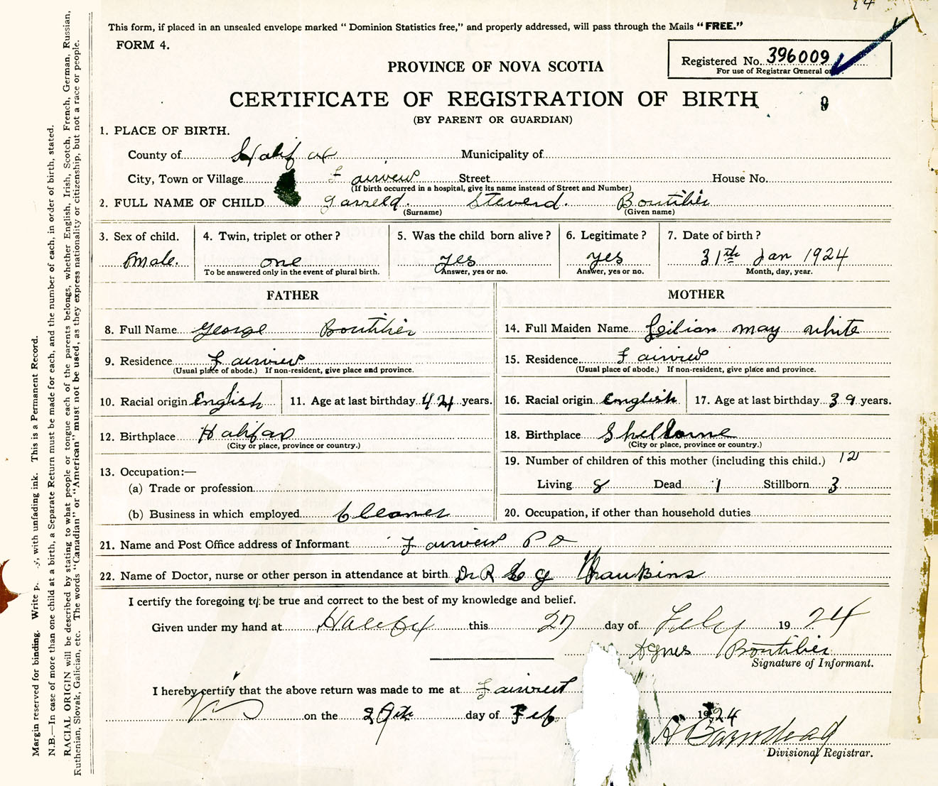 Male Birth Registration: Year: 1924 number: 39600009