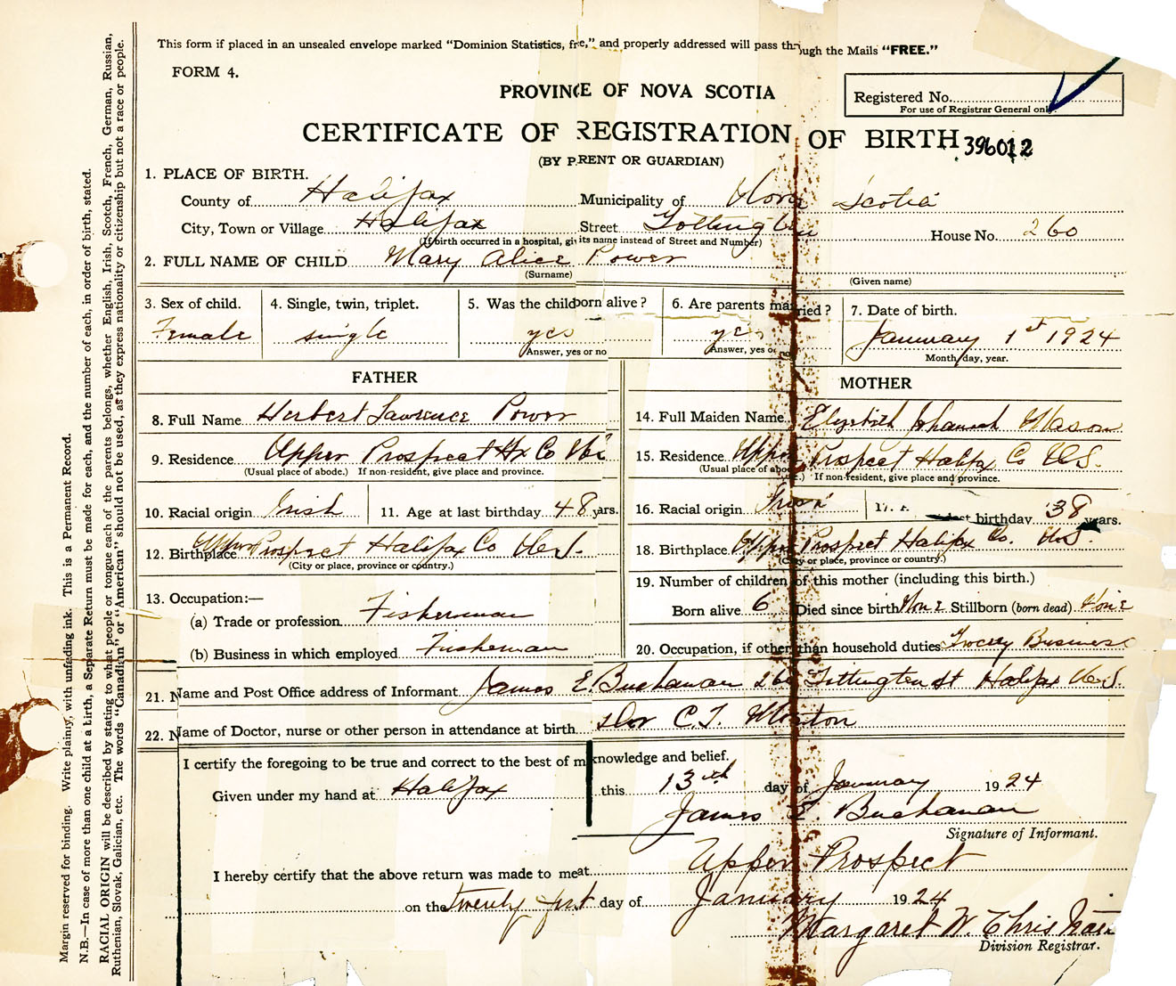 Female Birth Registration: Year: 1924 number: 39600012