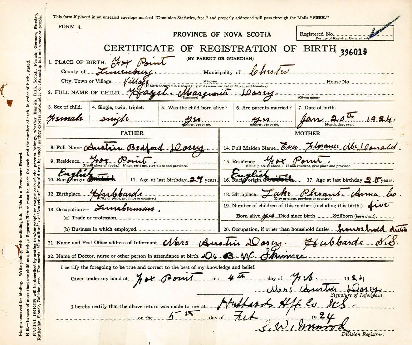 Female Birth Registration: Year: 1924 number: 39600019