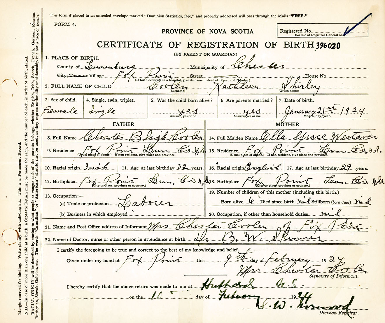 Female Birth Registration: Year: 1924 number: 39600020