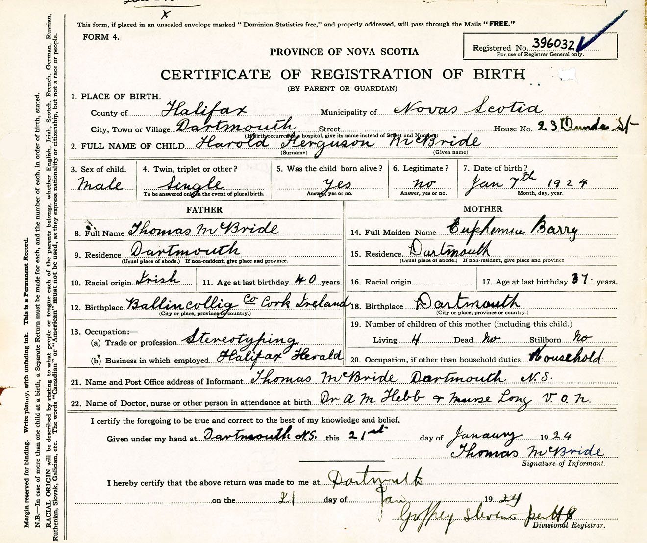 Male Birth Registration: Year: 1924 number: 39600032