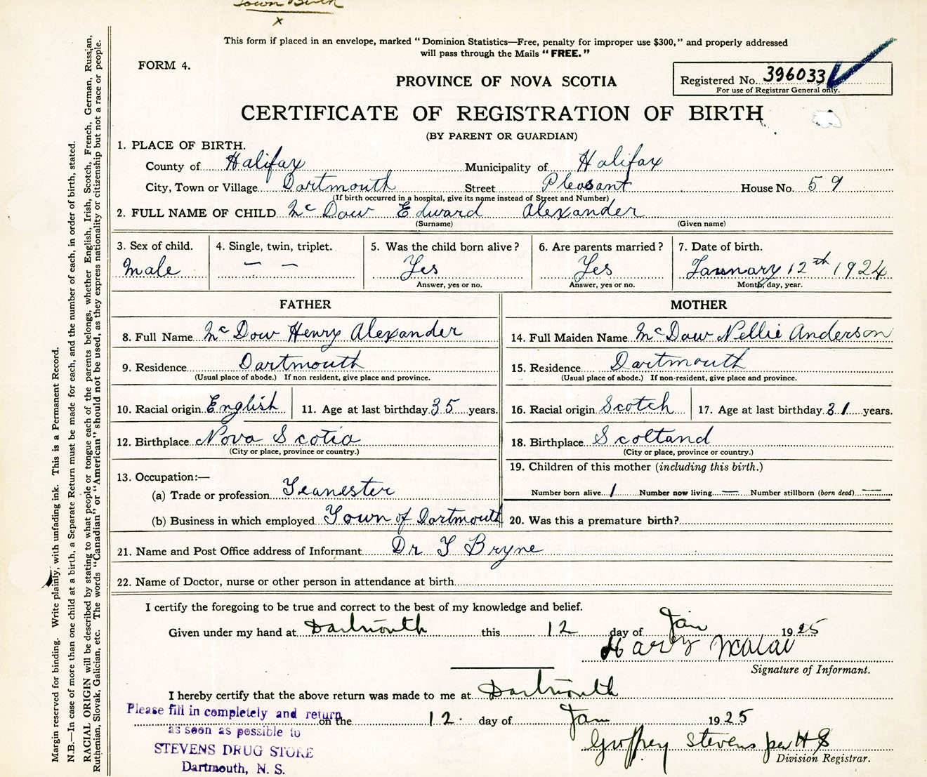 Male Birth Registration: Year: 1924 number: 39600033