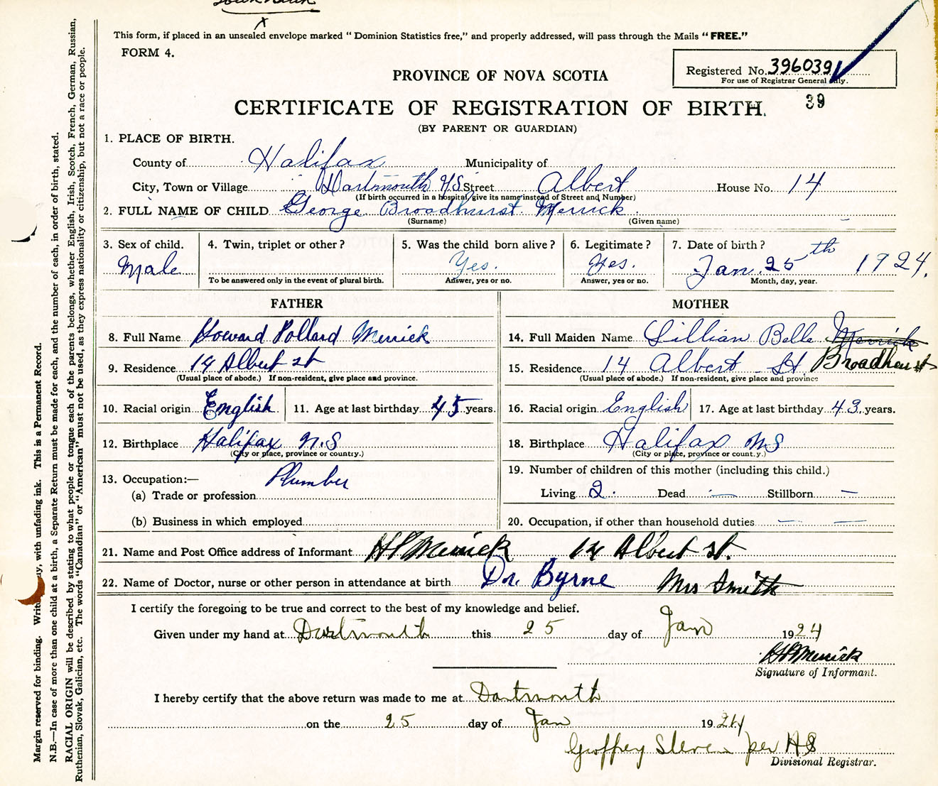 Male Birth Registration: Year: 1924 number: 39600039