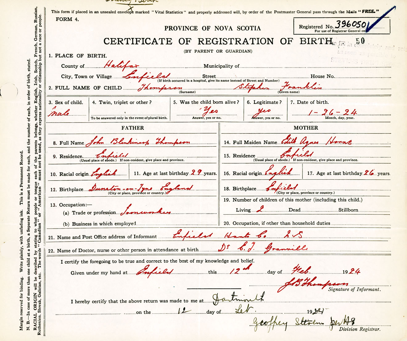Male Birth Registration: Year: 1924 number: 39600050