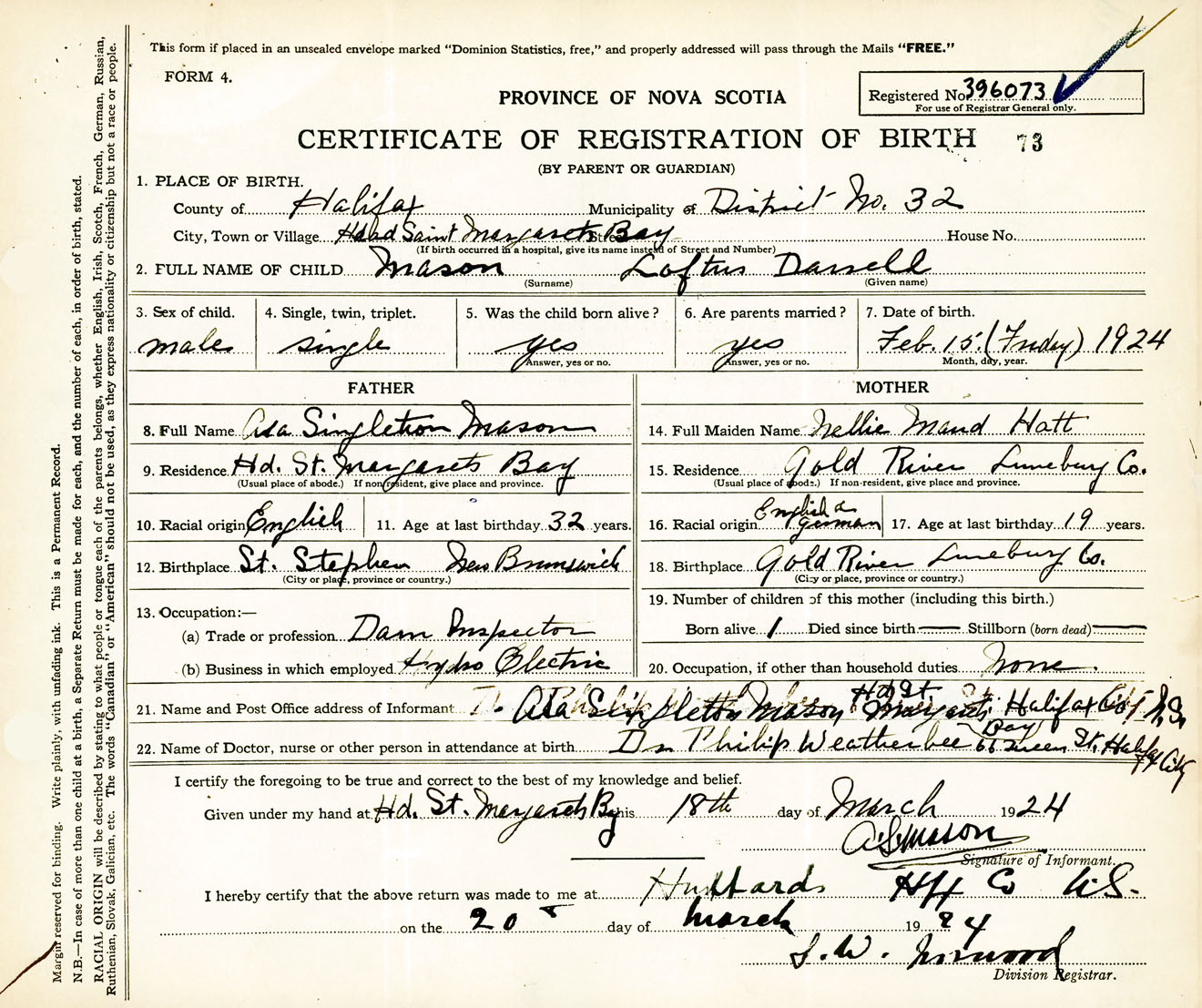 Male Birth Registration: Year: 1924 number: 39600073