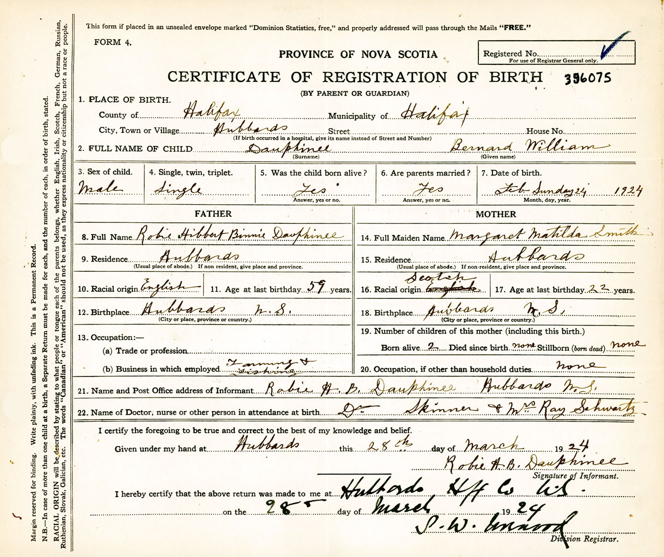 Male Birth Registration: Year: 1924 number: 39600075