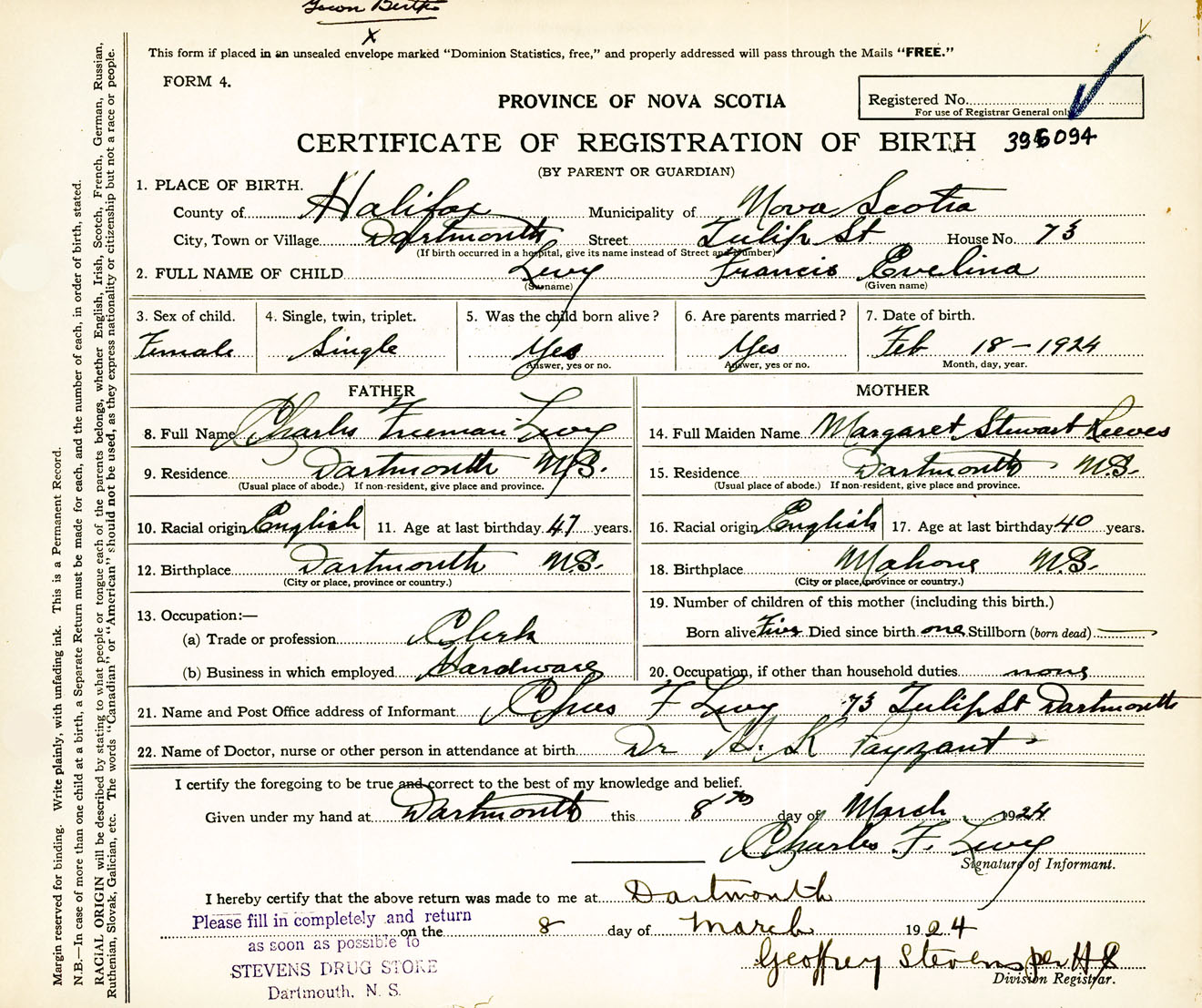Female Birth Registration: Year: 1924 number: 39600094