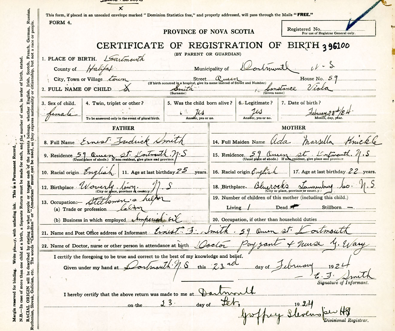 Female Birth Registration: Year: 1924 number: 39600100