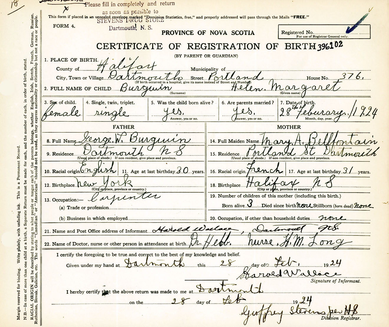 Female Birth Registration: Year: 1924 number: 39600102