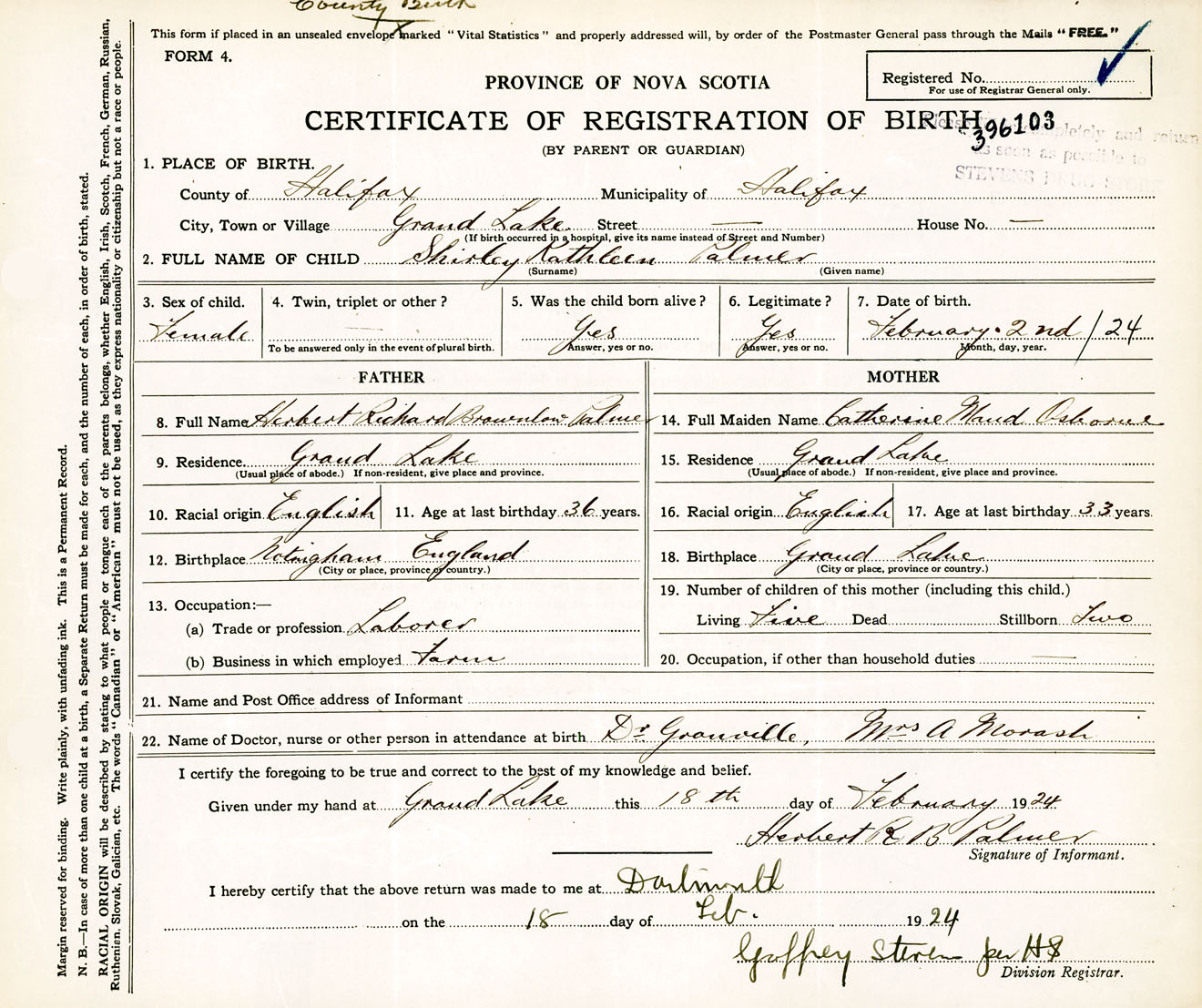 Female Birth Registration: Year: 1924 number: 39600103