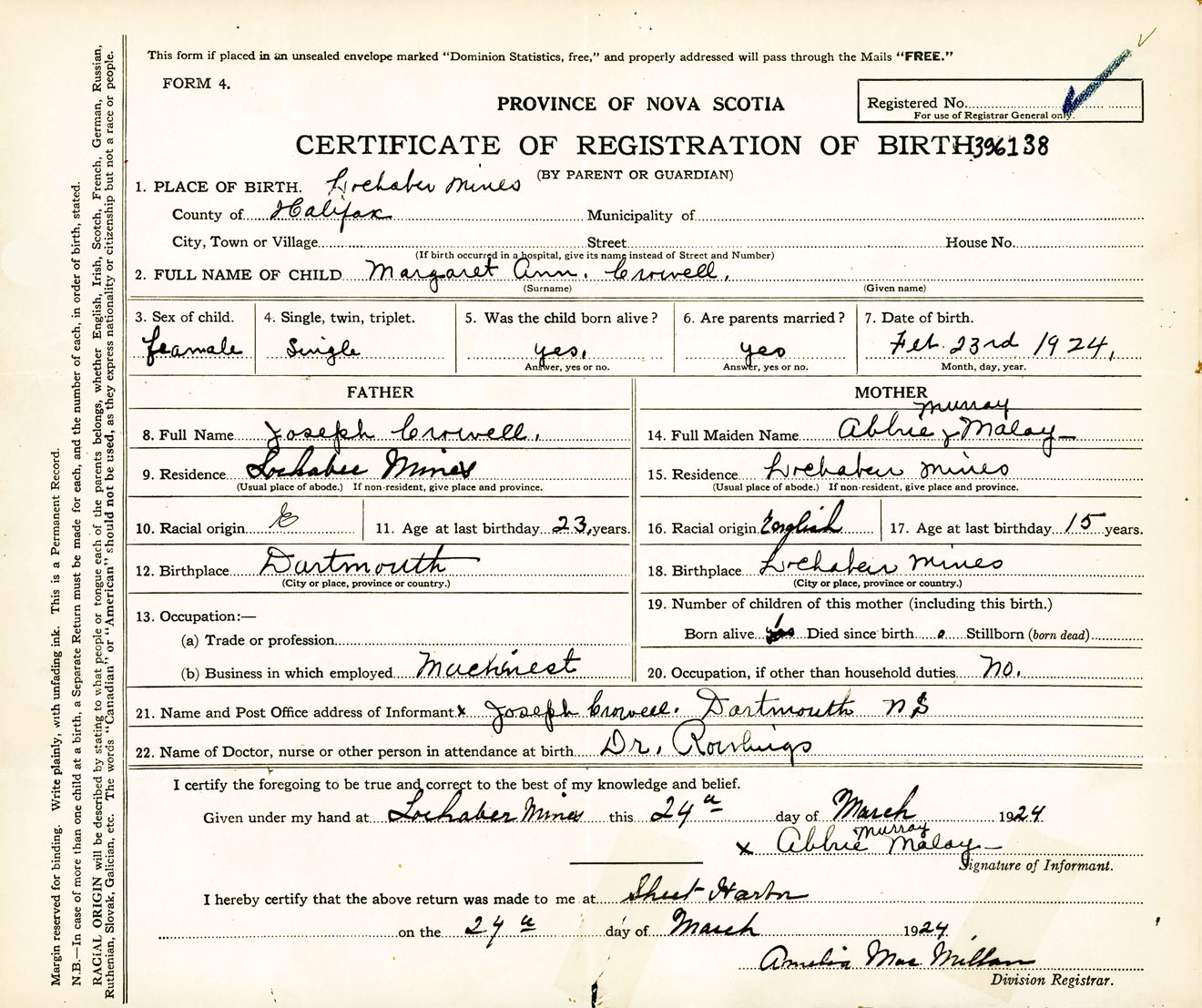 Female Birth Registration: Year: 1924 number: 39600138