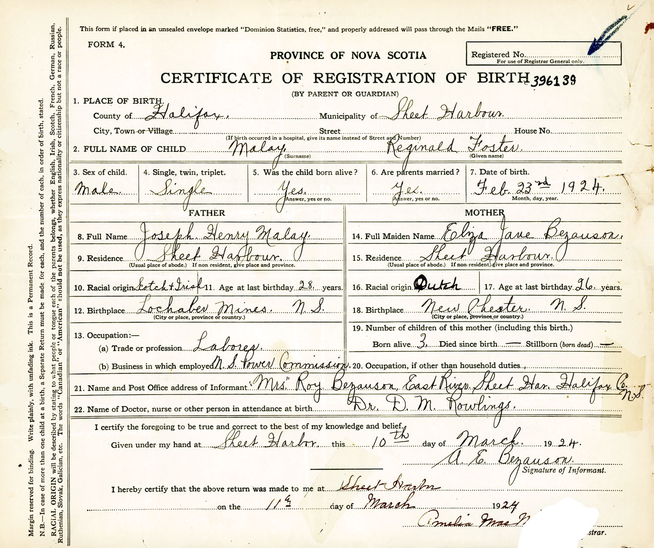 Male Birth Registration: Year: 1924 number: 39600139