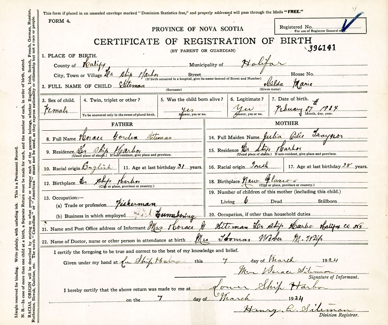 Female Birth Registration: Year: 1924 number: 39600141