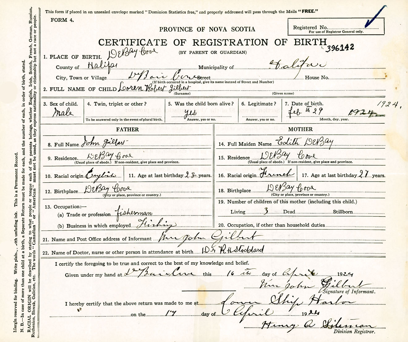 Male Birth Registration: Year: 1924 number: 39600142