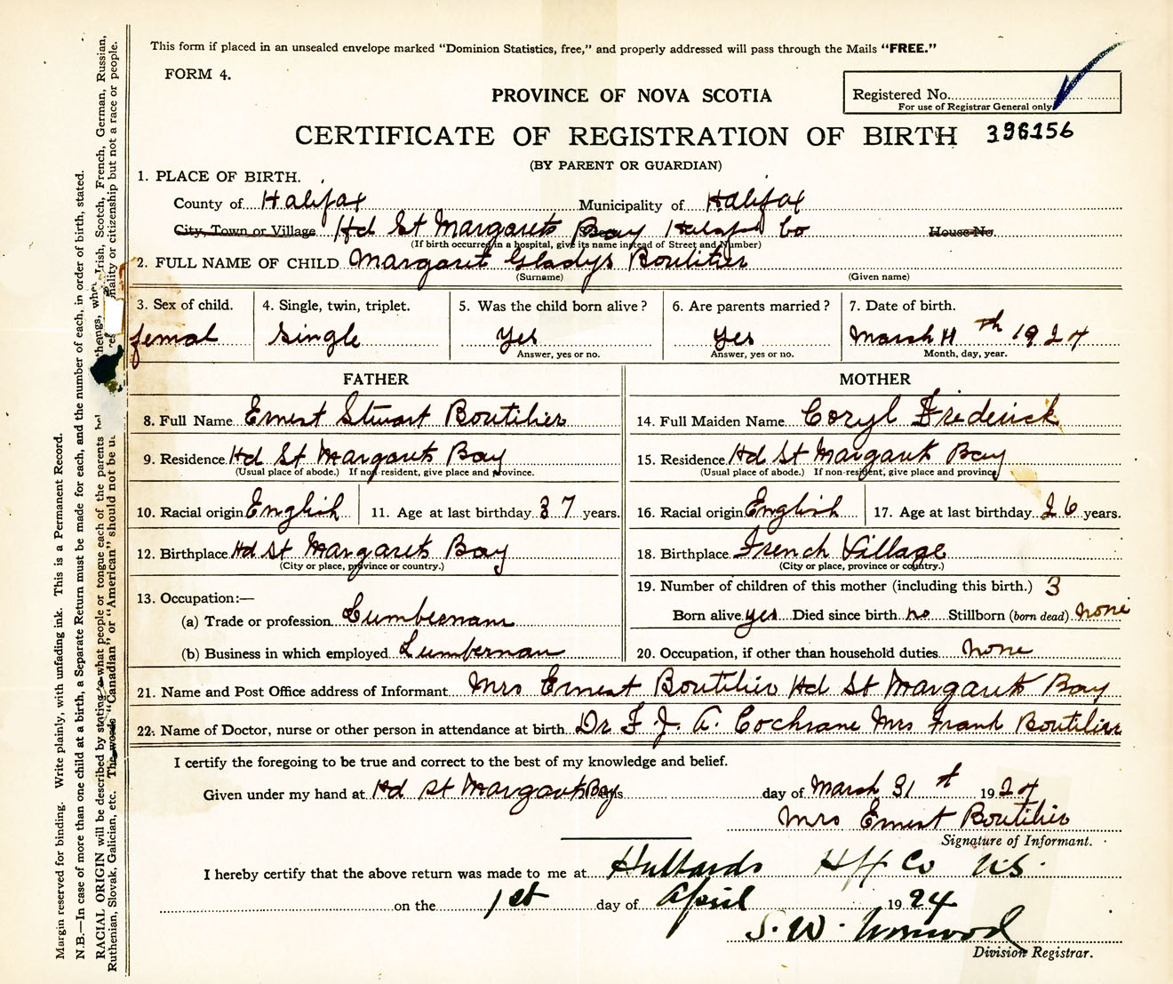 Female Birth Registration: Year: 1924 number: 39600156