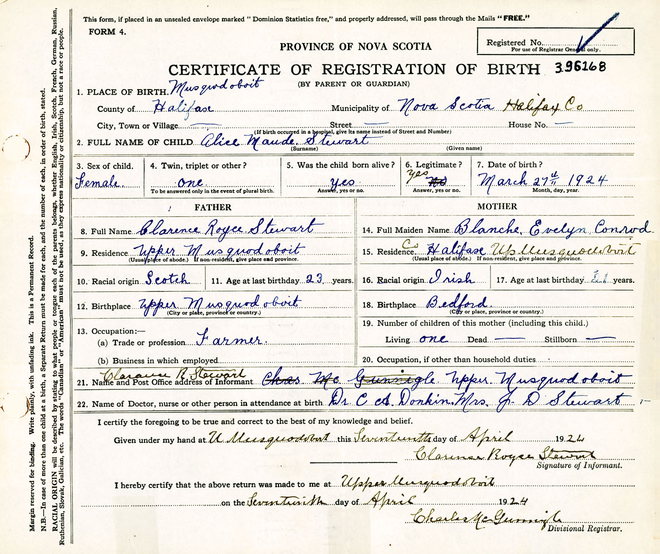 Female Birth Registration: Year: 1924 number: 39600168