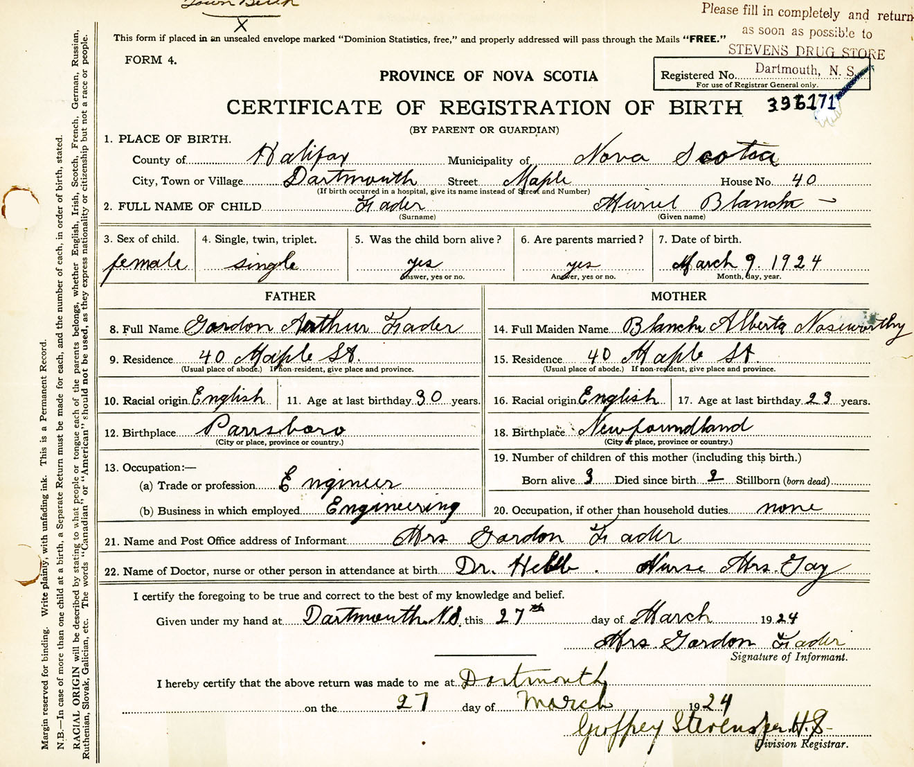 Female Birth Registration: Year: 1924 number: 39600171