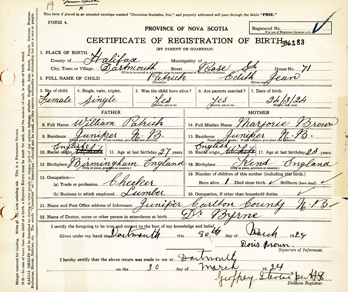 Female Birth Registration: Year: 1924 number: 39600183