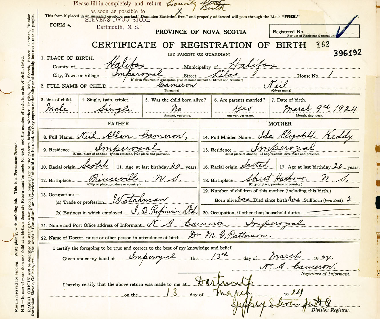 Male Birth Registration: Year: 1924 number: 39600192