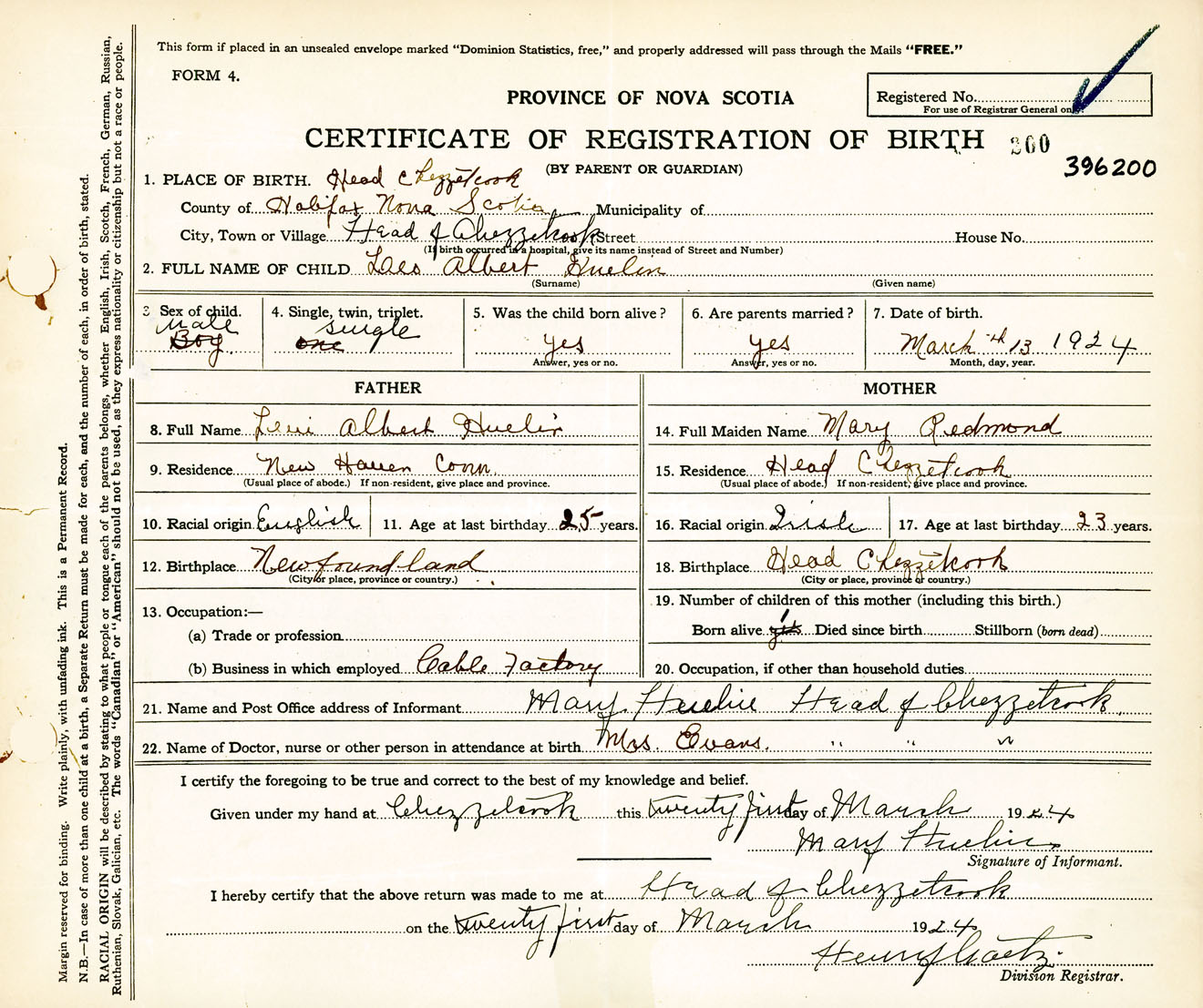 Male Birth Registration: Year: 1924 number: 39600200