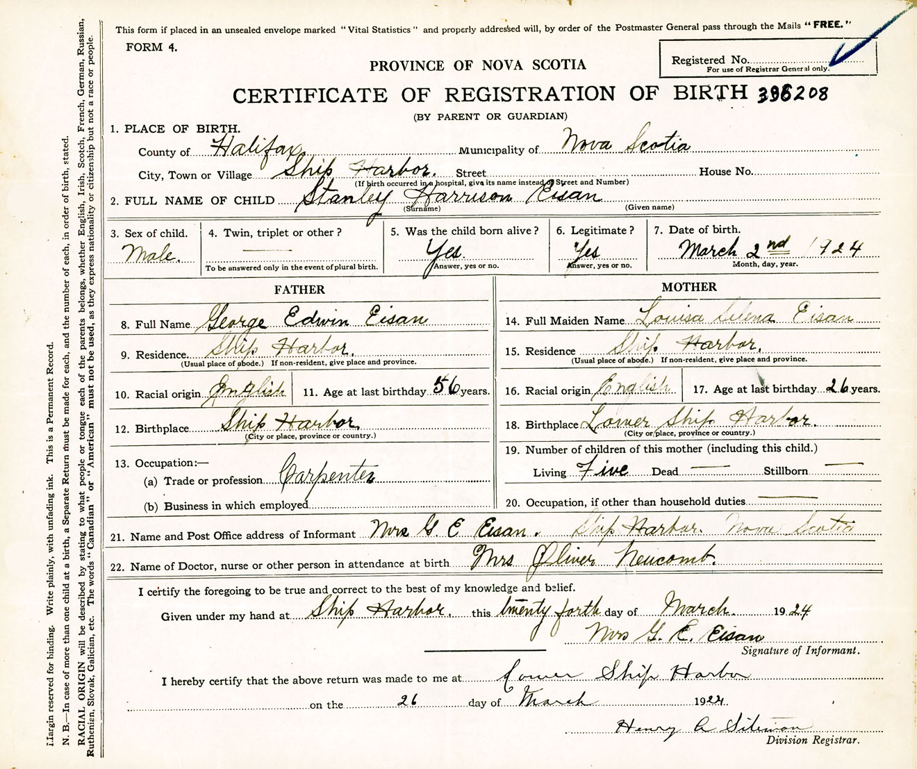 Male Birth Registration: Year: 1924 number: 39600208