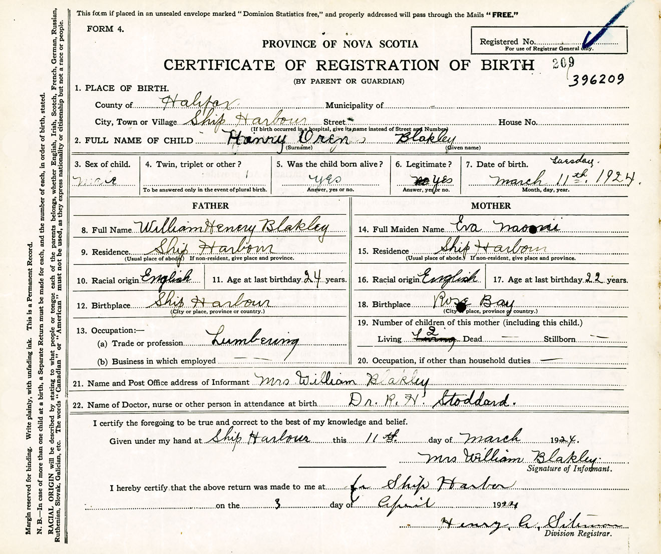 Male Birth Registration: Year: 1924 number: 39600209