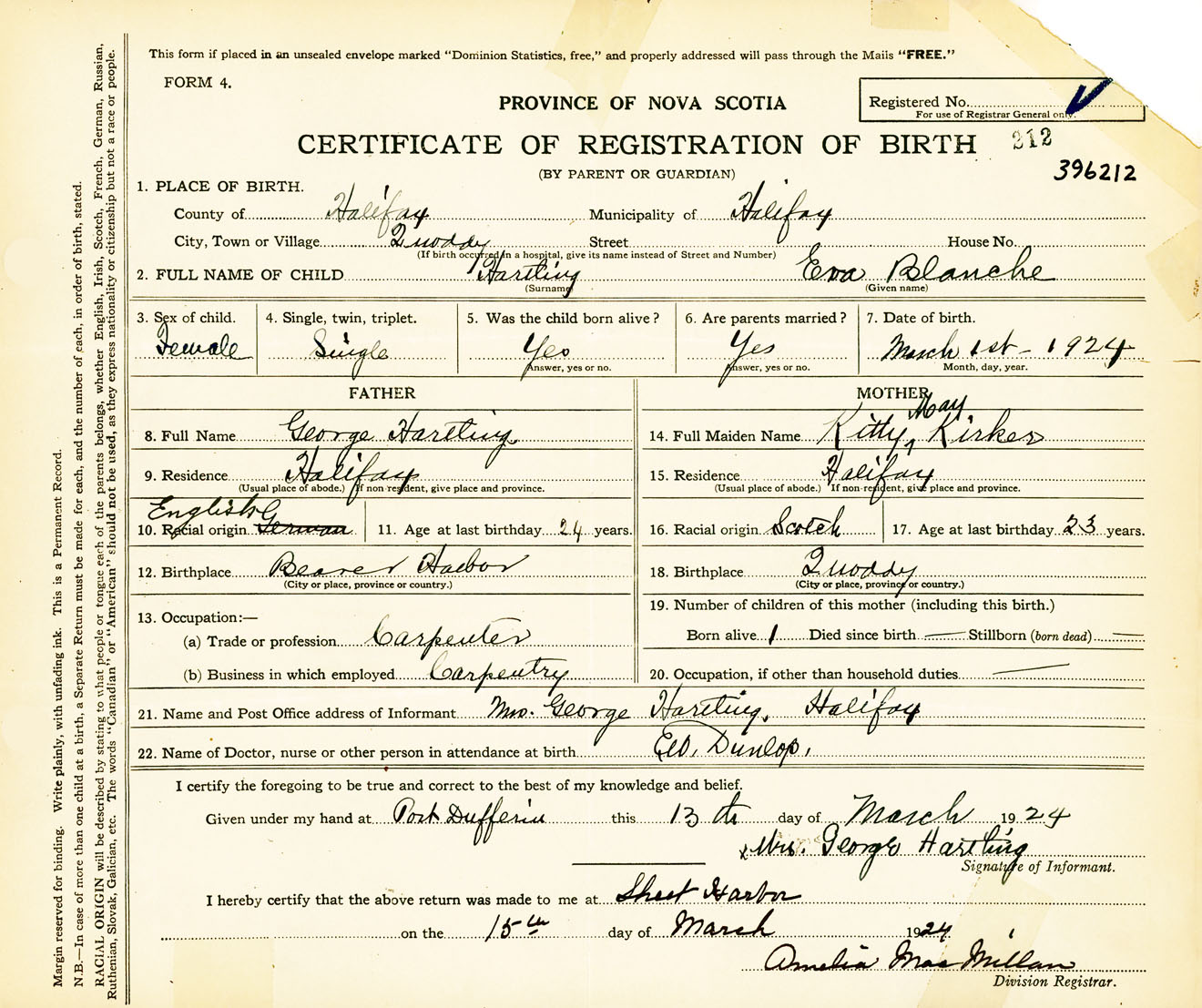 Female Birth Registration: Year: 1924 number: 39600212