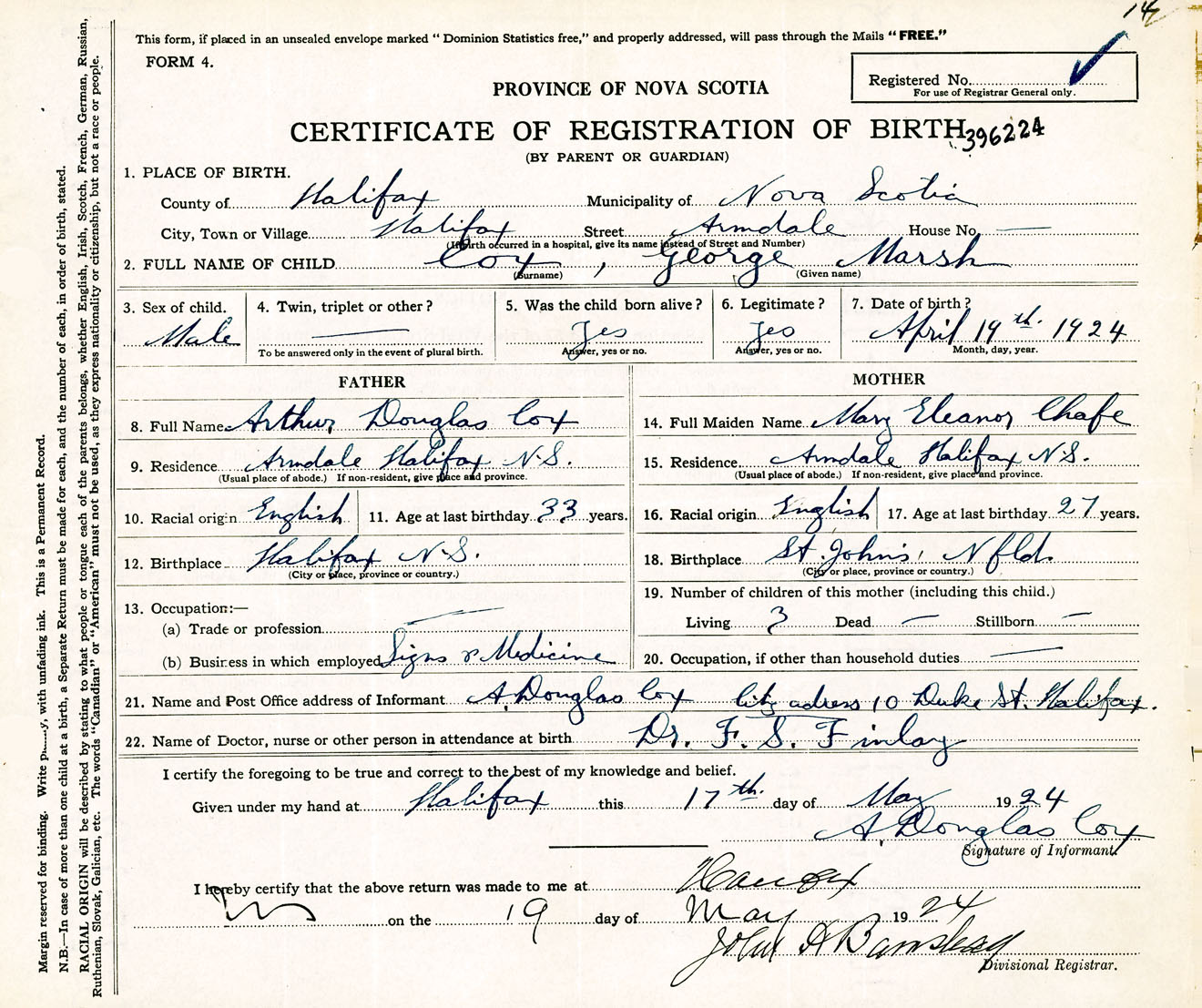 Male Birth Registration: Year: 1924 number: 39600224