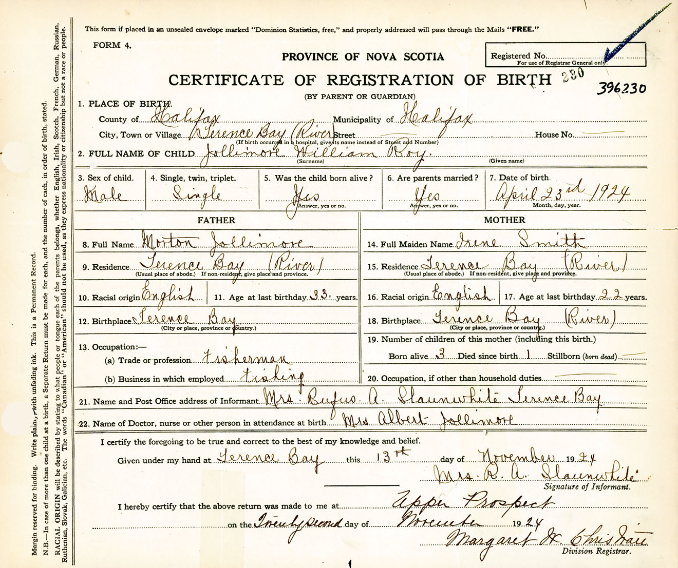 Male Birth Registration: Year: 1924 number: 39600230