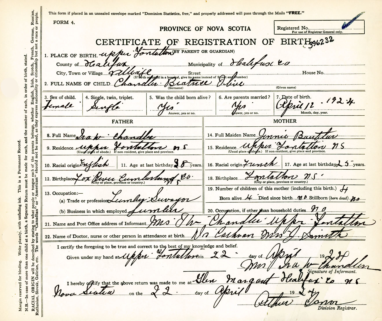 Female Birth Registration: Year: 1924 number: 39600232