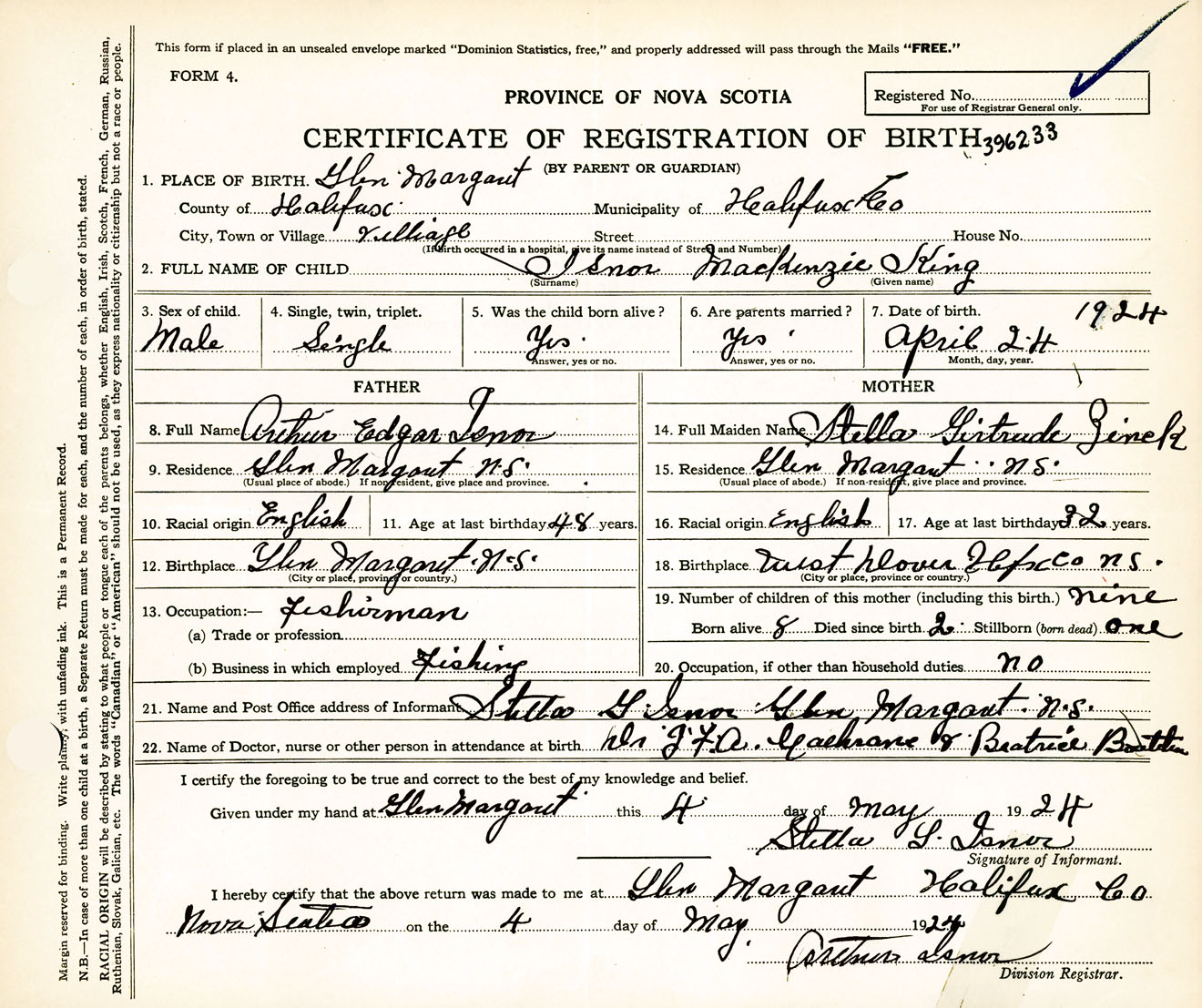 Male Birth Registration: Year: 1924 number: 39600233