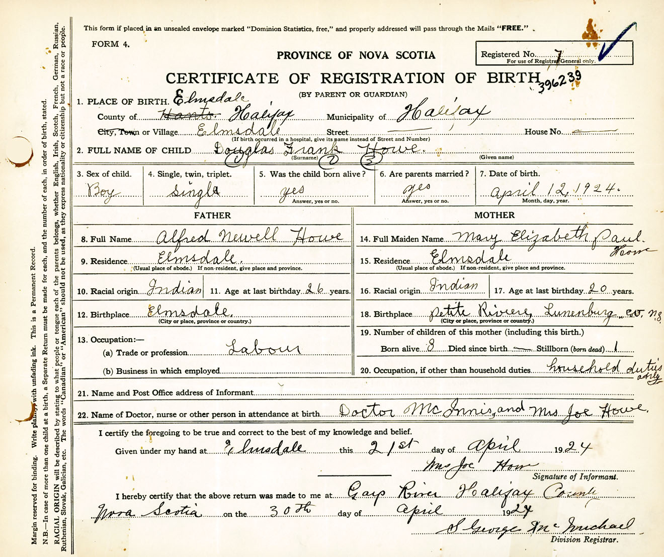 Male Birth Registration: Year: 1924 number: 39600239