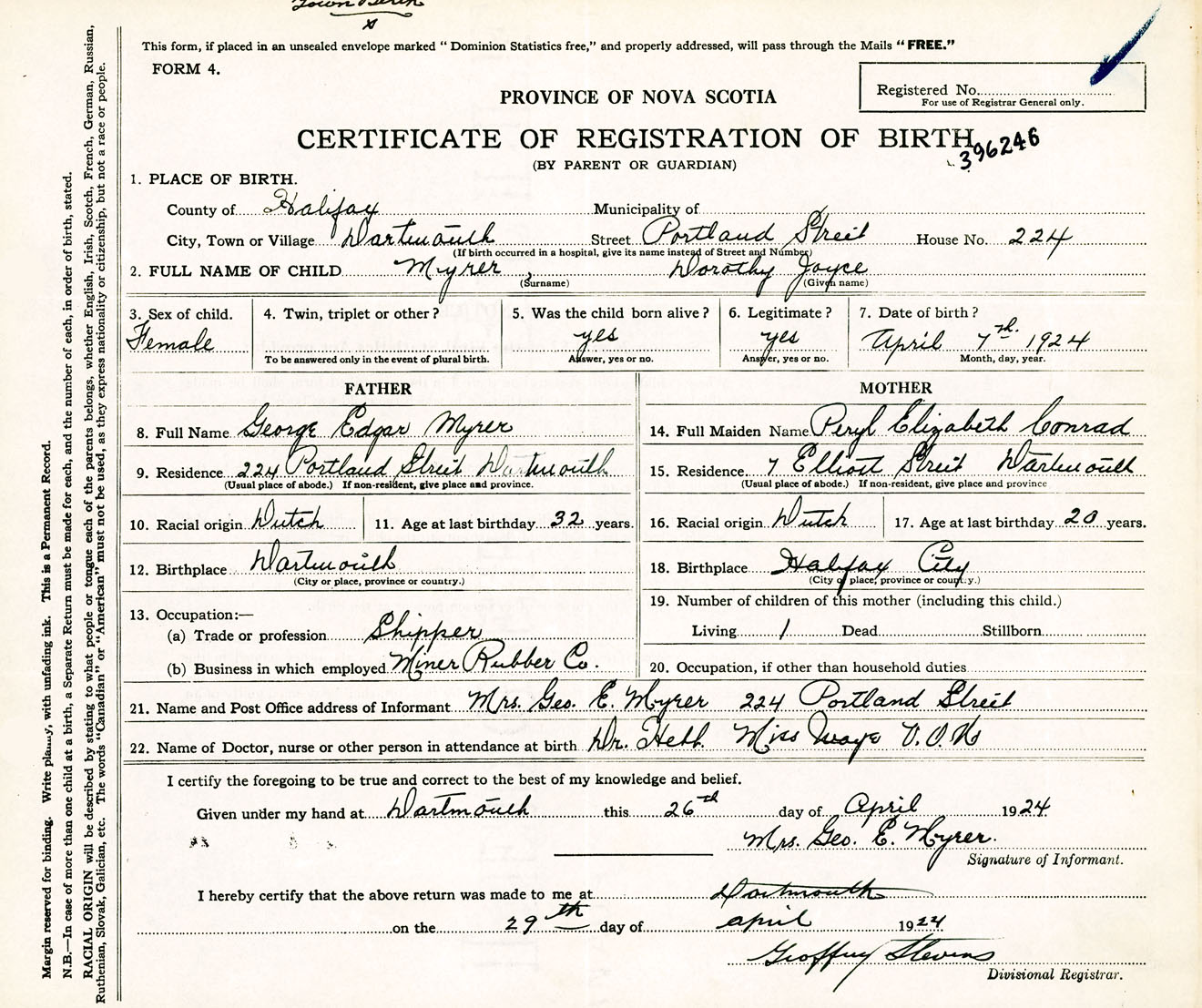Female Birth Registration: Year: 1924 number: 39600246