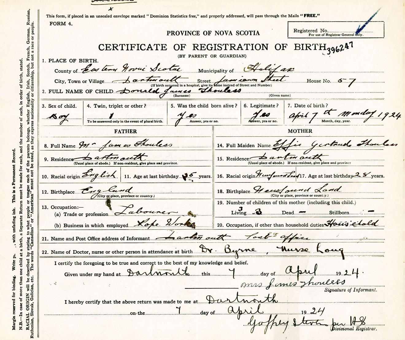 Male Birth Registration: Year: 1924 number: 39600247
